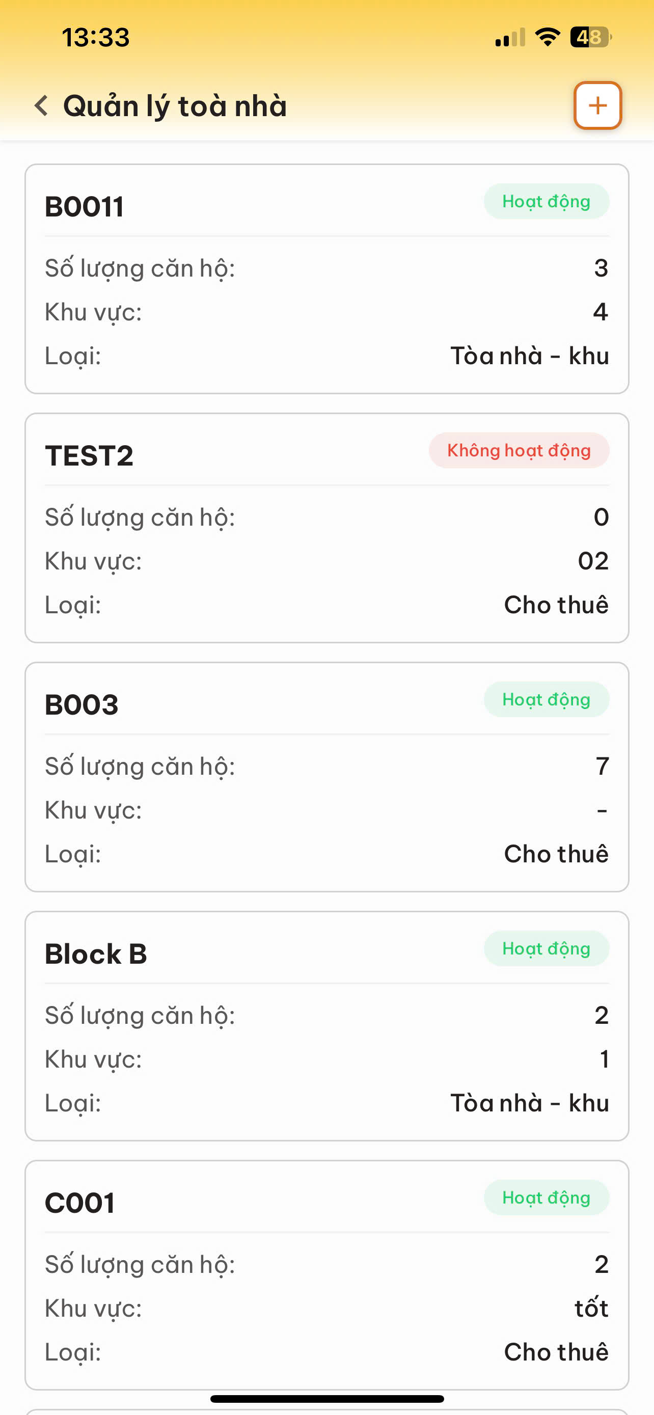 Tên/Mã tòa nhà: Hiển thị in đậm (Ví dụ: B0011, TEST2, Block B...).