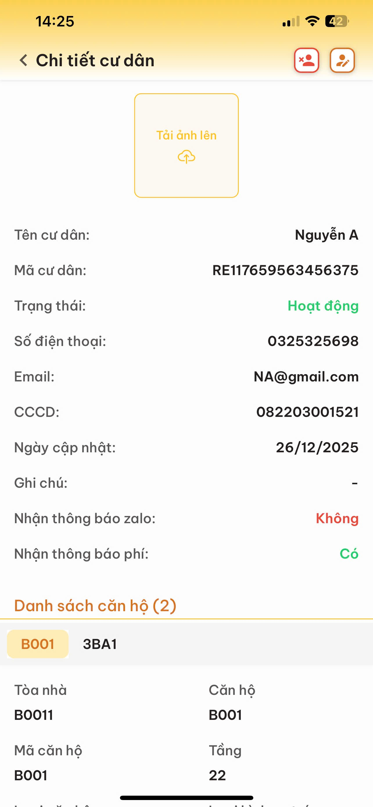 Nhấn trực tiếp vào tên cư dân để xem chi tiết hồ sơ. Tại đây bạn có thể cập nhật lại số điện thoại, ngày sinh hoặc thay đổi vai trò của họ.