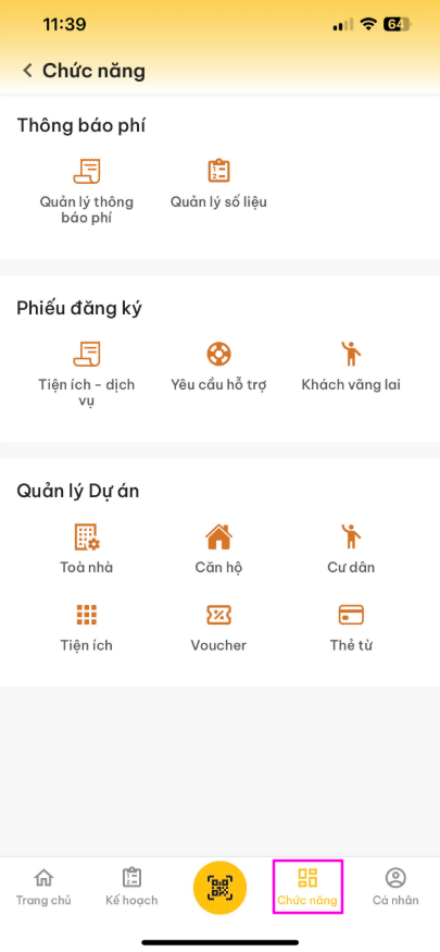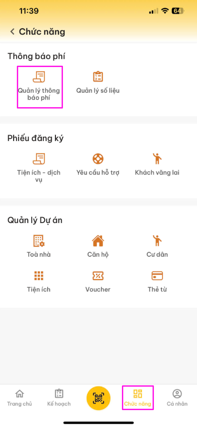 Nhân viên đăng nhập vào hệ thống -> Chọn " Chức năng" -> Hiển thị danh sách các chức năng quản lý của thông báo phí gồm