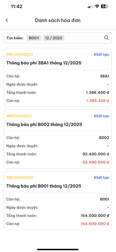 Còn nợ: Số tiền cư dân chưa đóng (Màu đỏ nếu còn nợ).