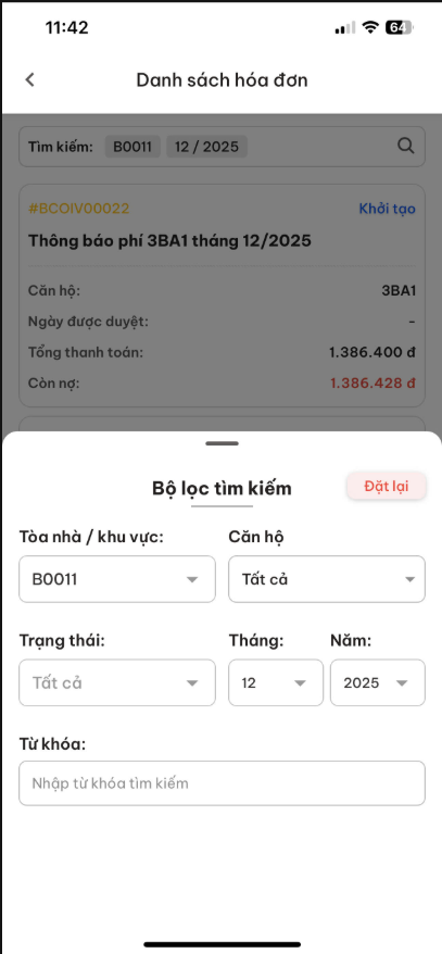 Căn hộ: Chọn mã căn hộ cụ thể hoặc để "Tất cả".