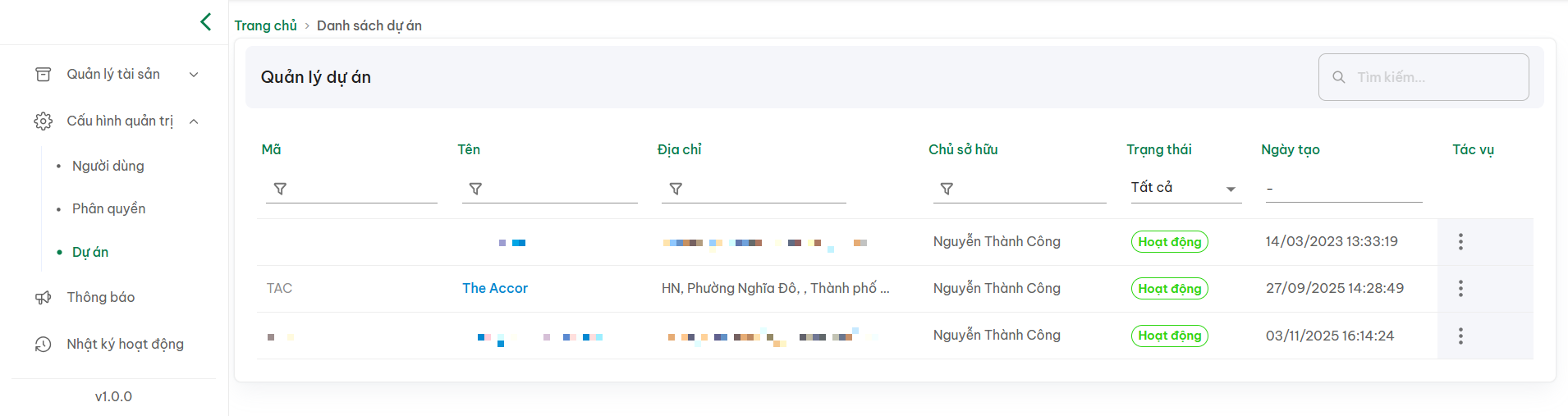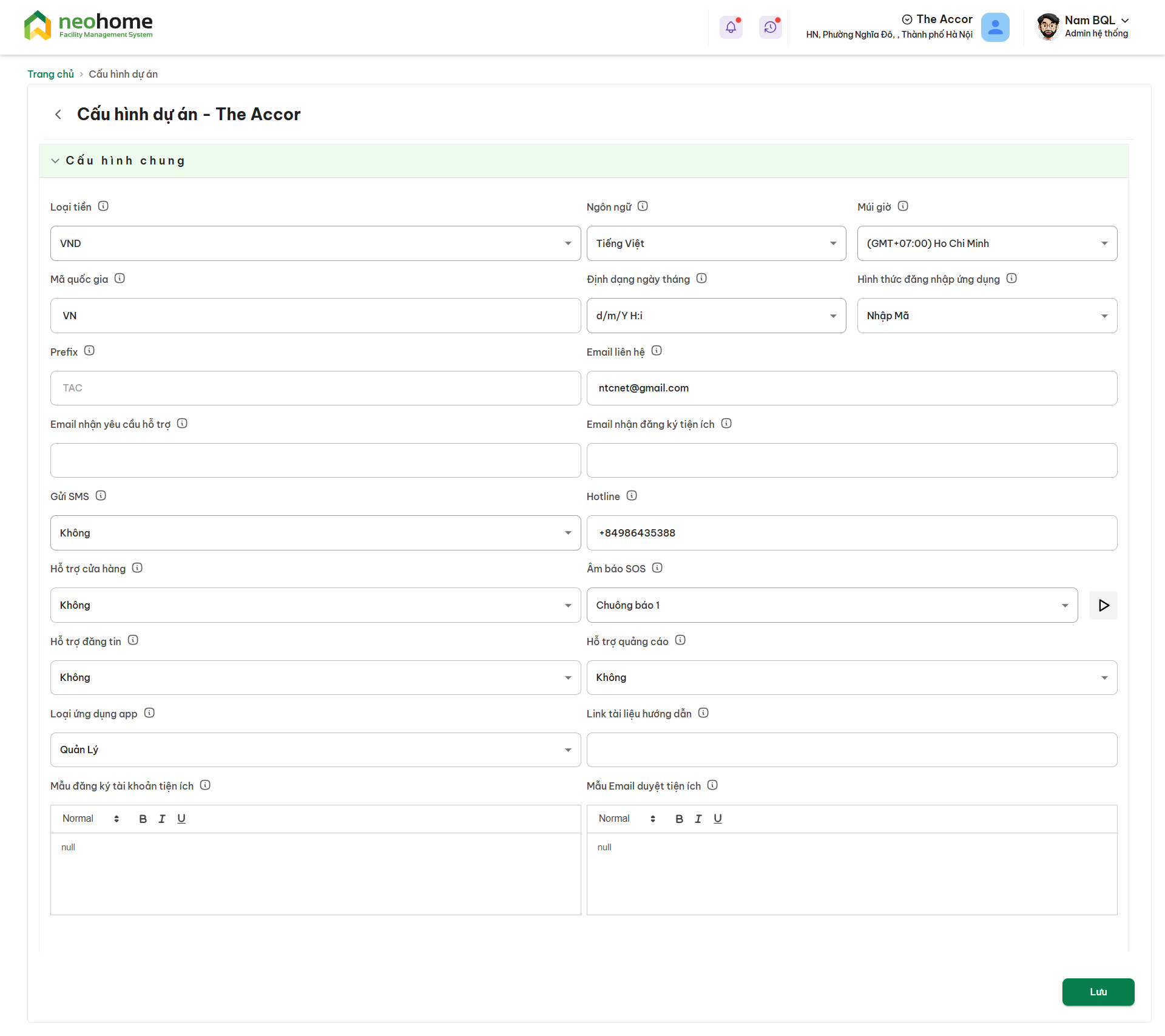 + ( 3 ) : Sau khi thay đổi thông tin của dự án, ví dụ **Địa chỉ và nhấn Cập nhật sau khi chỉnh sửa