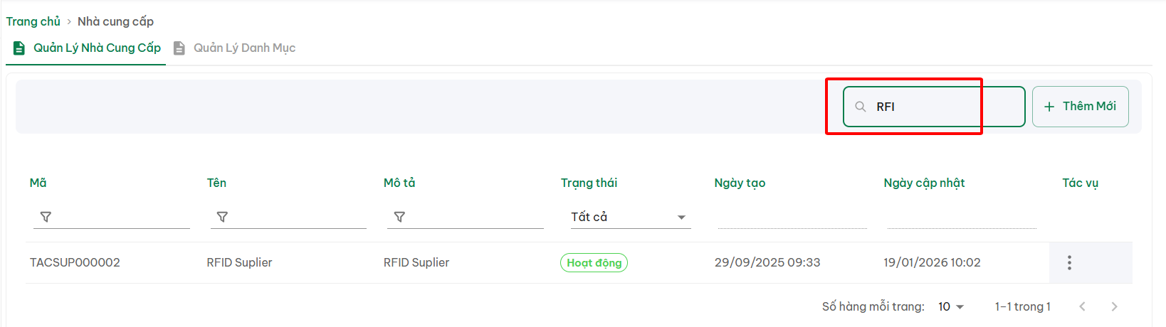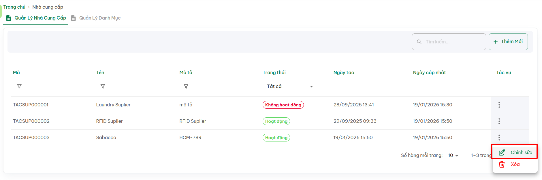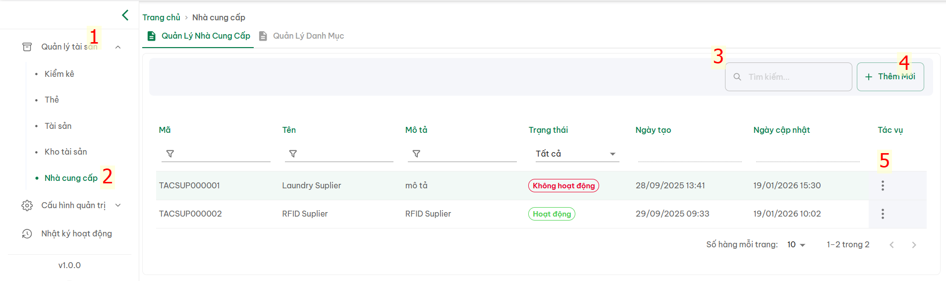 Gồm (1) Quản lý tài sản >nhấn (2) Nhà cung cấp > (3) Tra thông tin nội dung trên thanh tìm kiếm