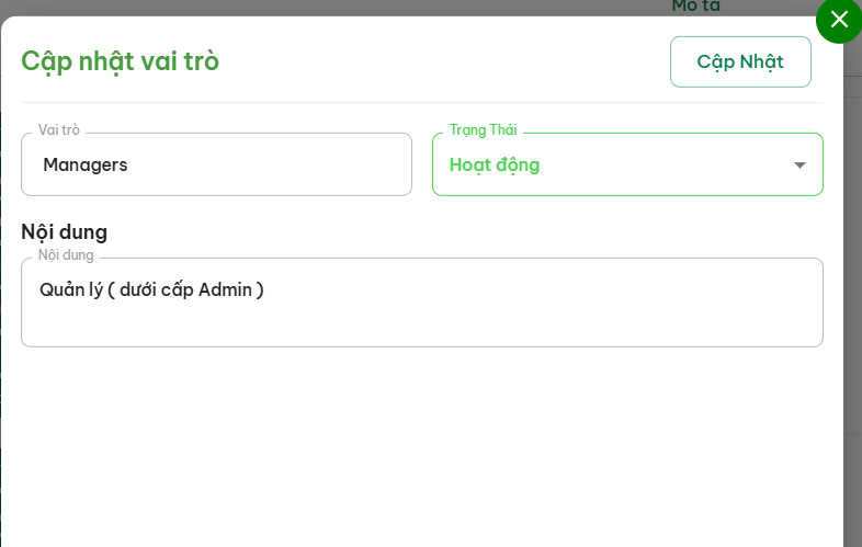 (4) Chỉnh sửa thông tin quyền : Sau khi bấm vô > Cập nhật thông tin ( Tên Vai trò | Trạng thái vai trò | Nội dung ) > Bấm Cập nhật
