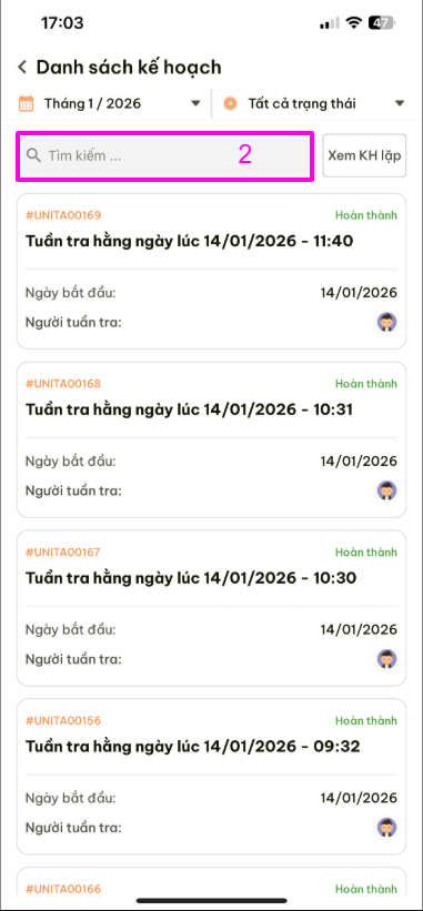 Thông tin hiện thị bao gồm: Mã | Tên kế hoạch | Ngày bắt đầu | Người tuần tra | Trạng thái.