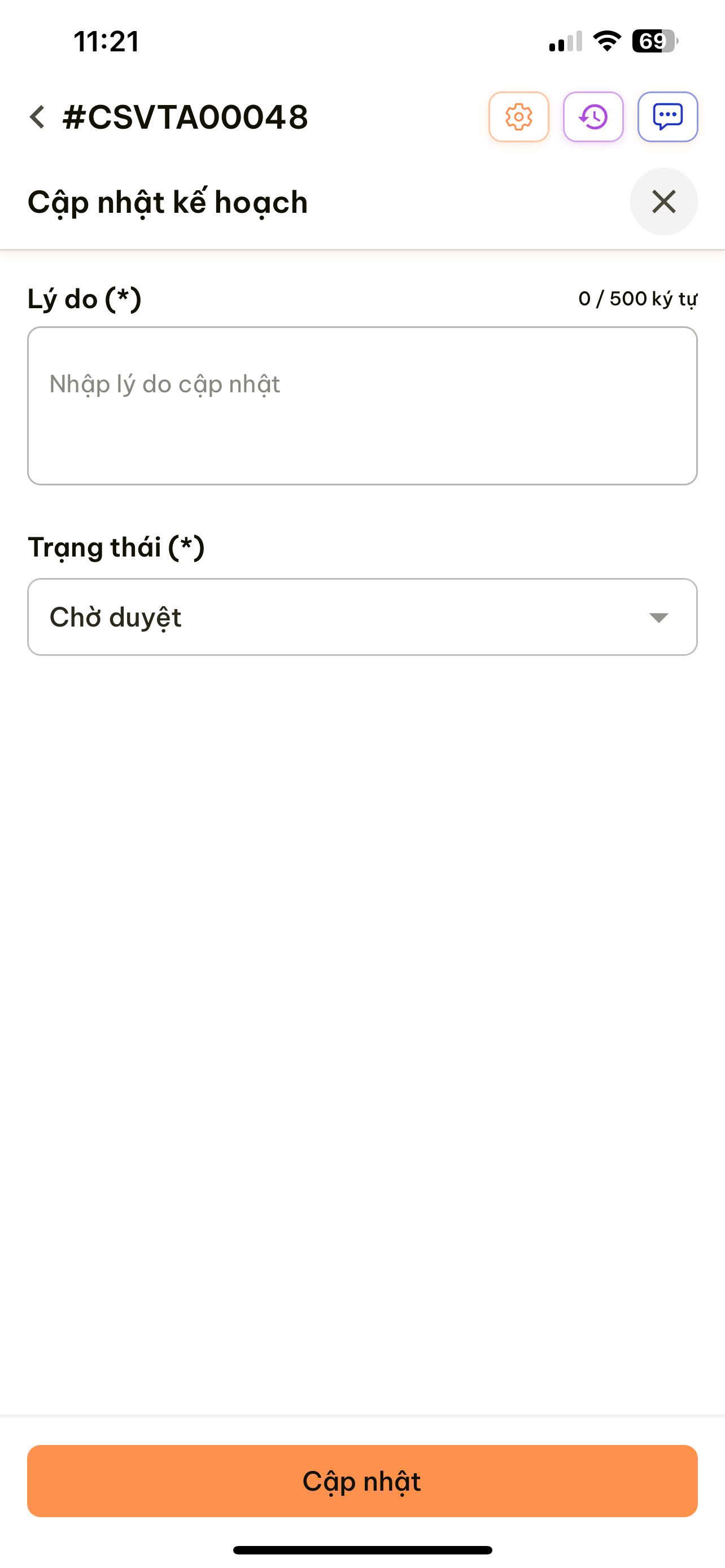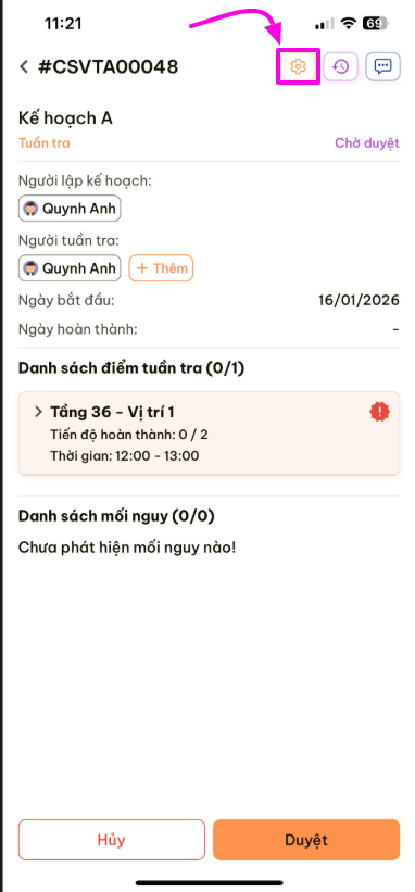 | Bước thực hiện: Vô app > Chọn kế hoạch KHÔNG có trạng thái " Hủy" hoặc" Hoàn thành" > Chọn biểu tượng " Cài đặt" |