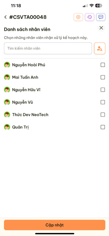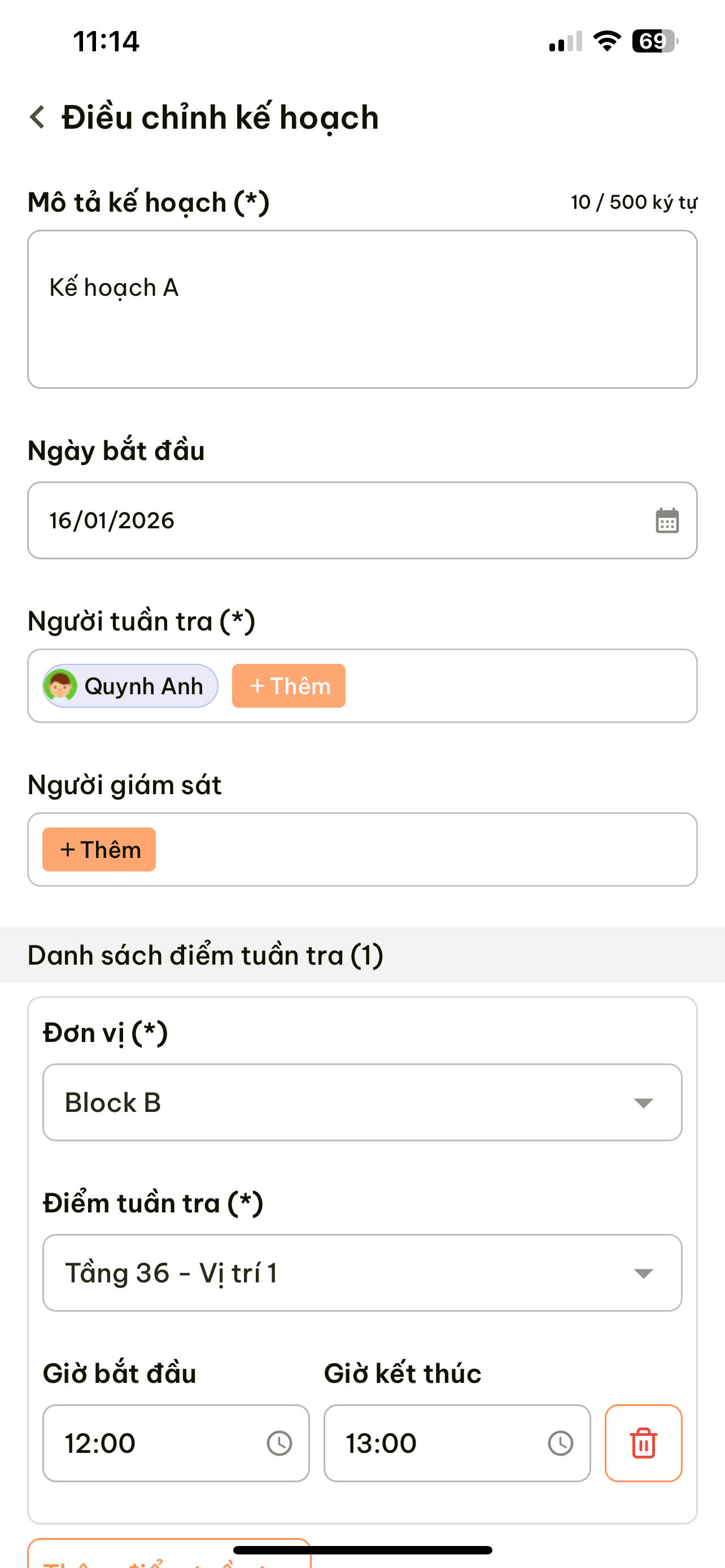 | Có thể thêm Người tuần tra ở màn hình chi tiết kế hoạch | Khi bấm vào nút " Thêm" > Giao diện hiện thị danh sách nhân viên để lựa chọn > bấm Tíck chọn > Bấm " Cập nhật" |