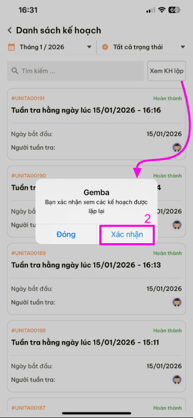Thao tác: Vào "Tổng công việc" hoặc "Danh sách công việc" > Bấm " Xem KH lặp" > Chọn "Xác nhận"