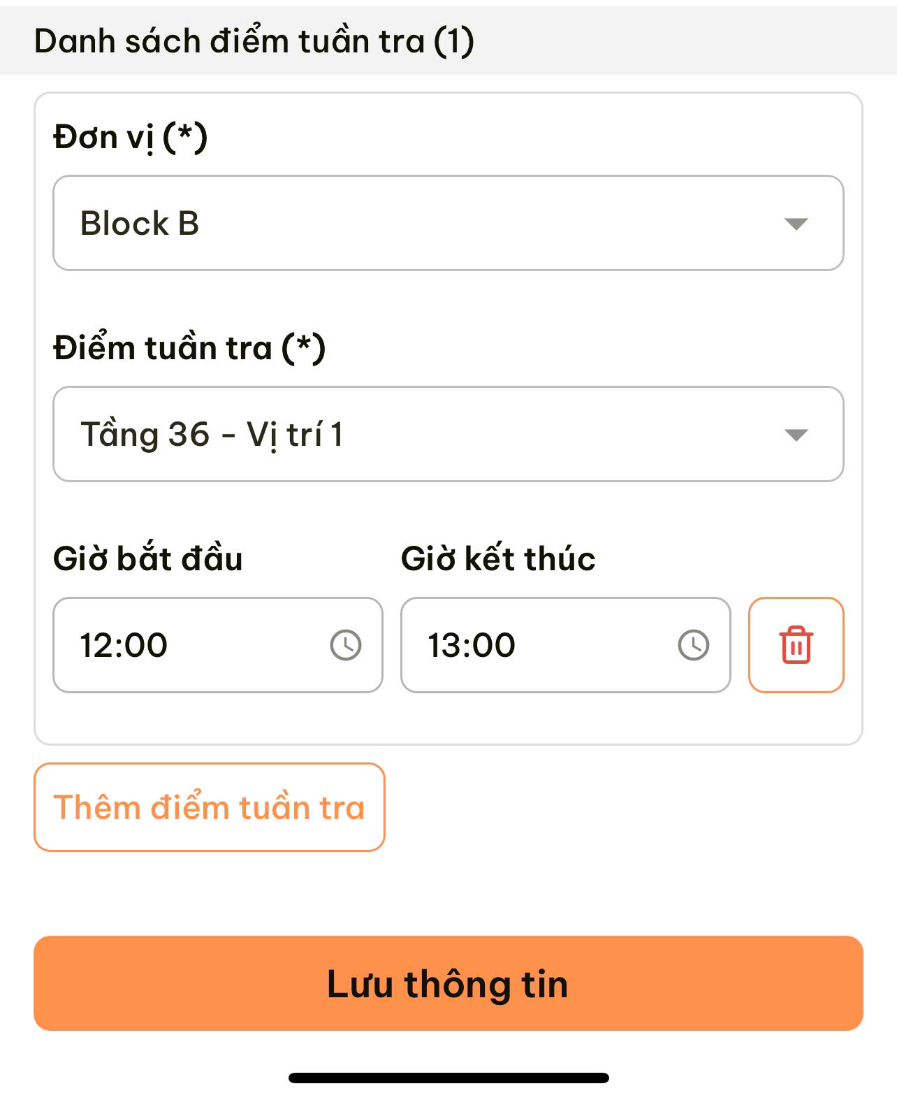 + Giờ bắt đầu - giờ kế thúc: Thời gian bắt đầu và kế thúc của điểm tuần tra.