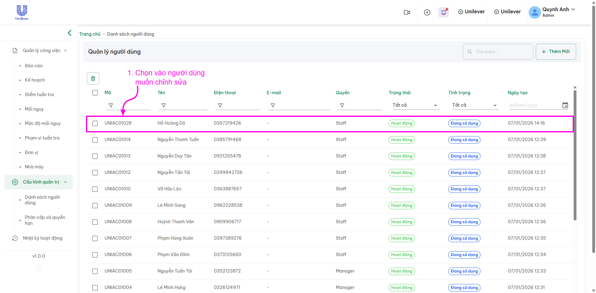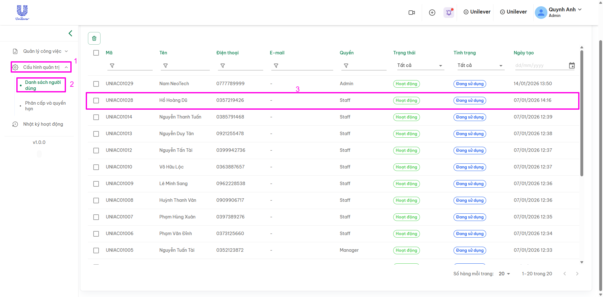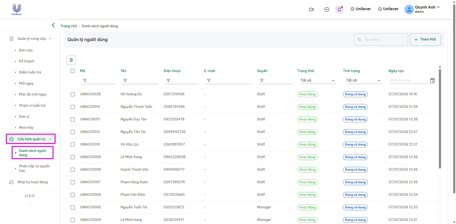 Mã | Tên | Điện thoại | E-mail | Vai trò | Trạng thái | Ngày tạo