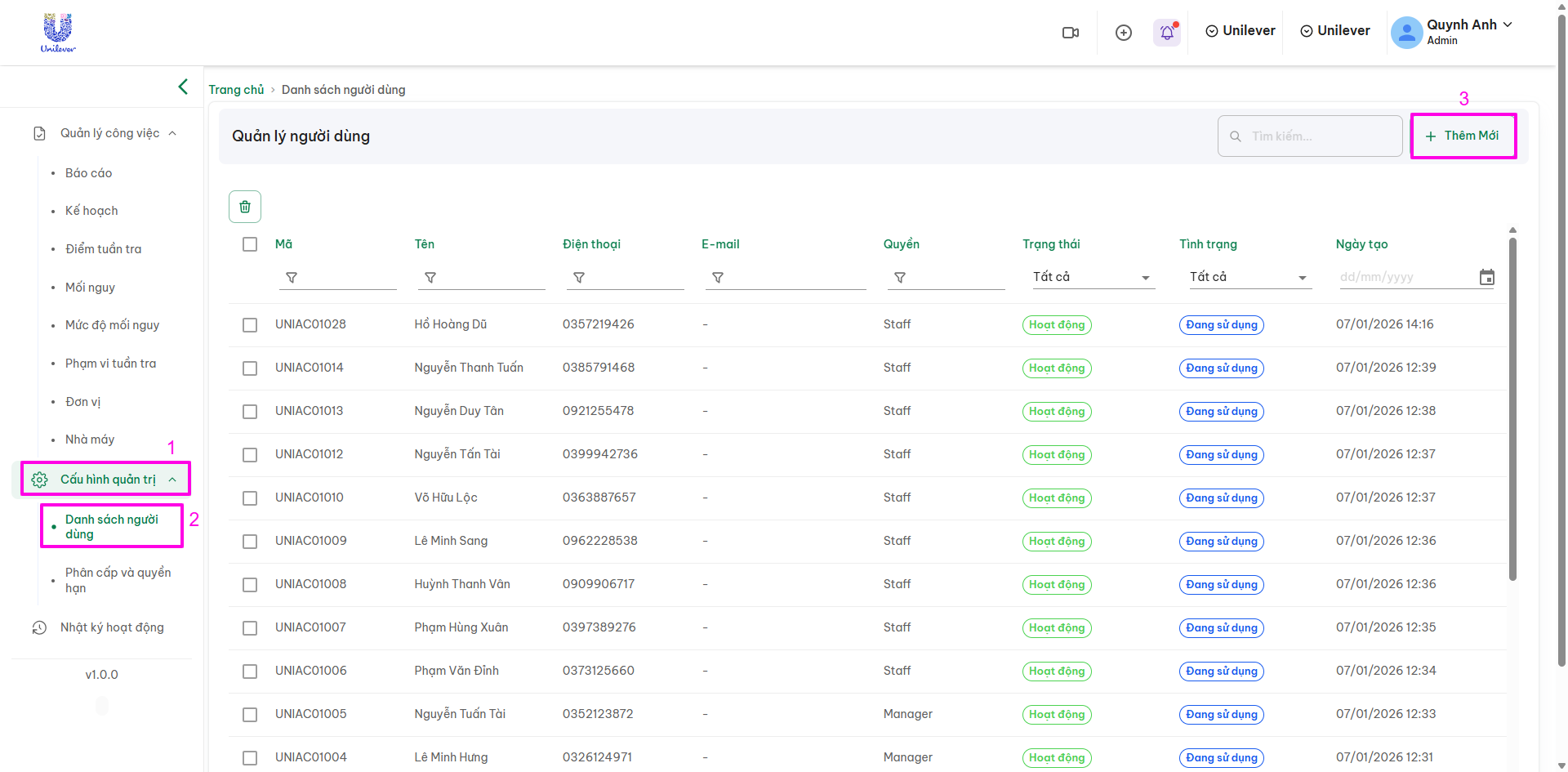 *Lưu ý: Chỉ có user nào cấp quyền"Phân quyền"(do Ban quản lý cấp) mới được thêm mới "Người dùng".