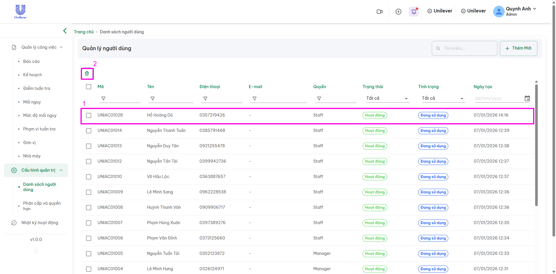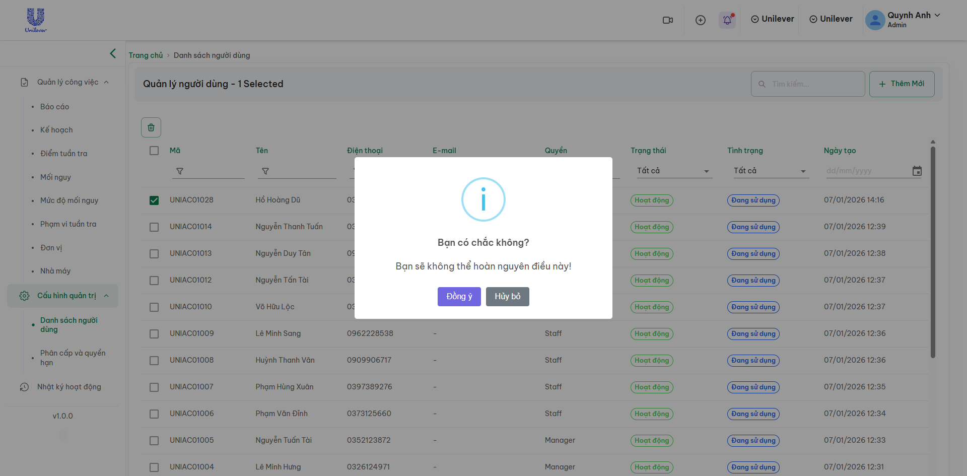 Nhấn “Đồng ý” → Hệ thống tiến hành xóa người dùng.
