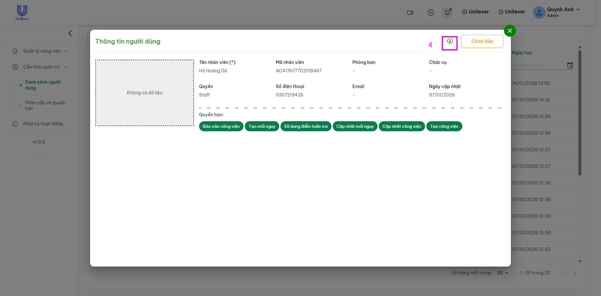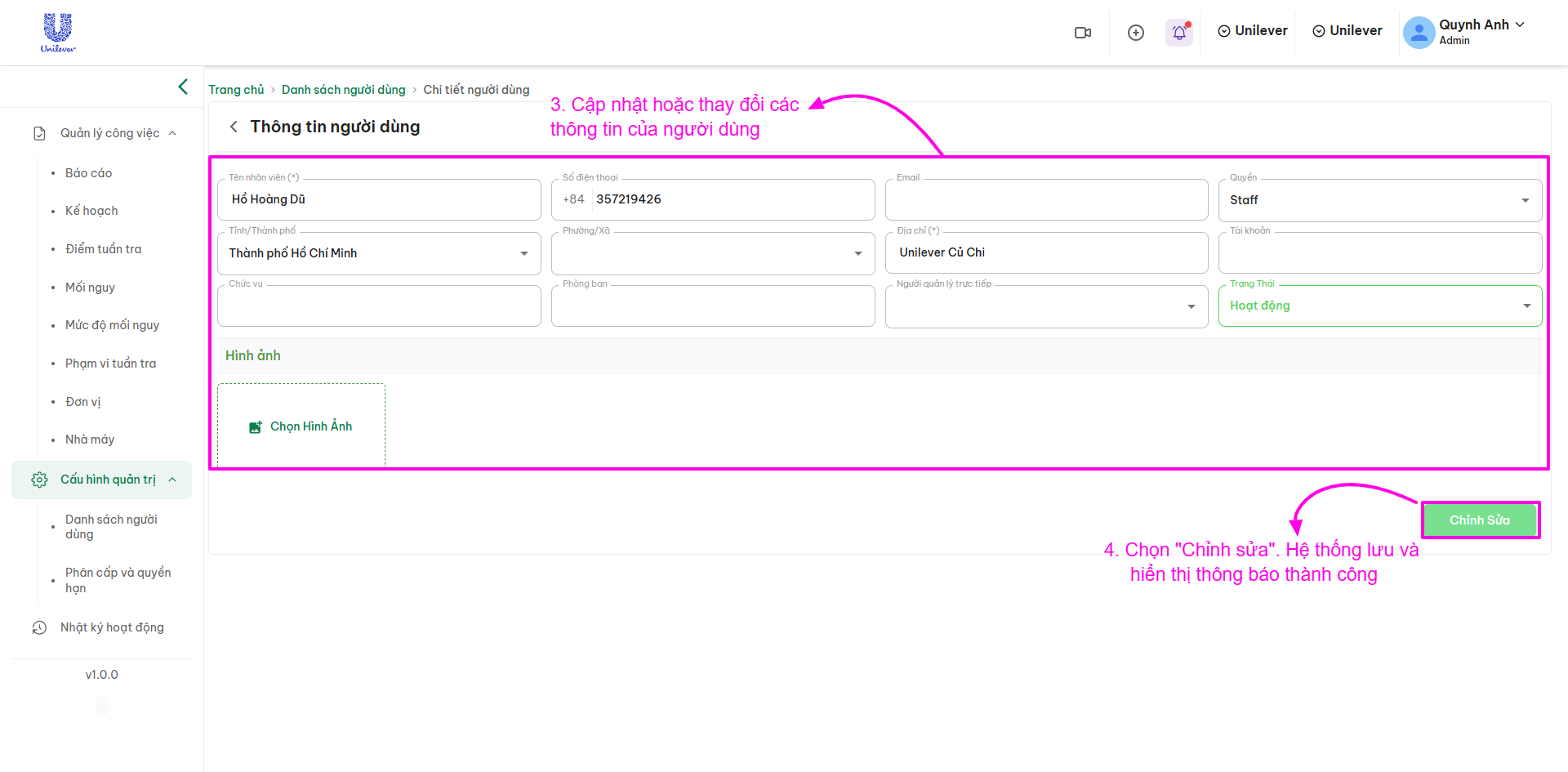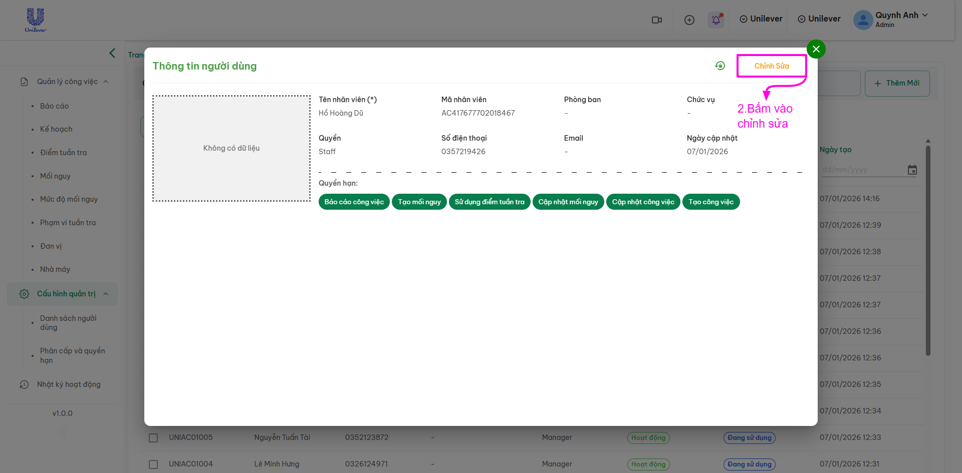 - Lưu ý: Trường "Chức vụ","Phòng ban" không được chỉnh sửa