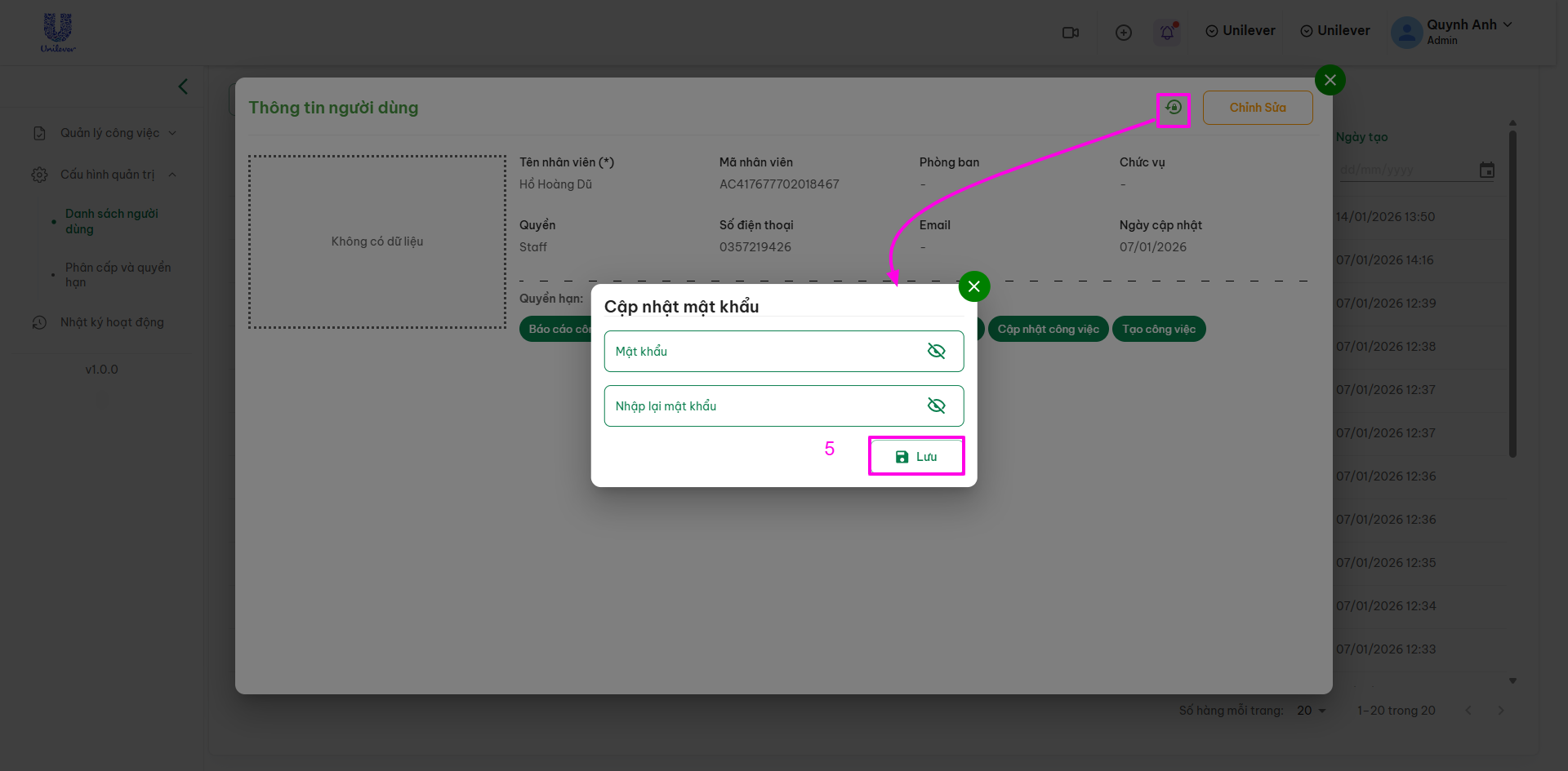 Bước 5: Nhập mật khẩu mới .Bấm "Lưu". Hệ thống lưu dữ liệu và hiển thị thông báo thành công.