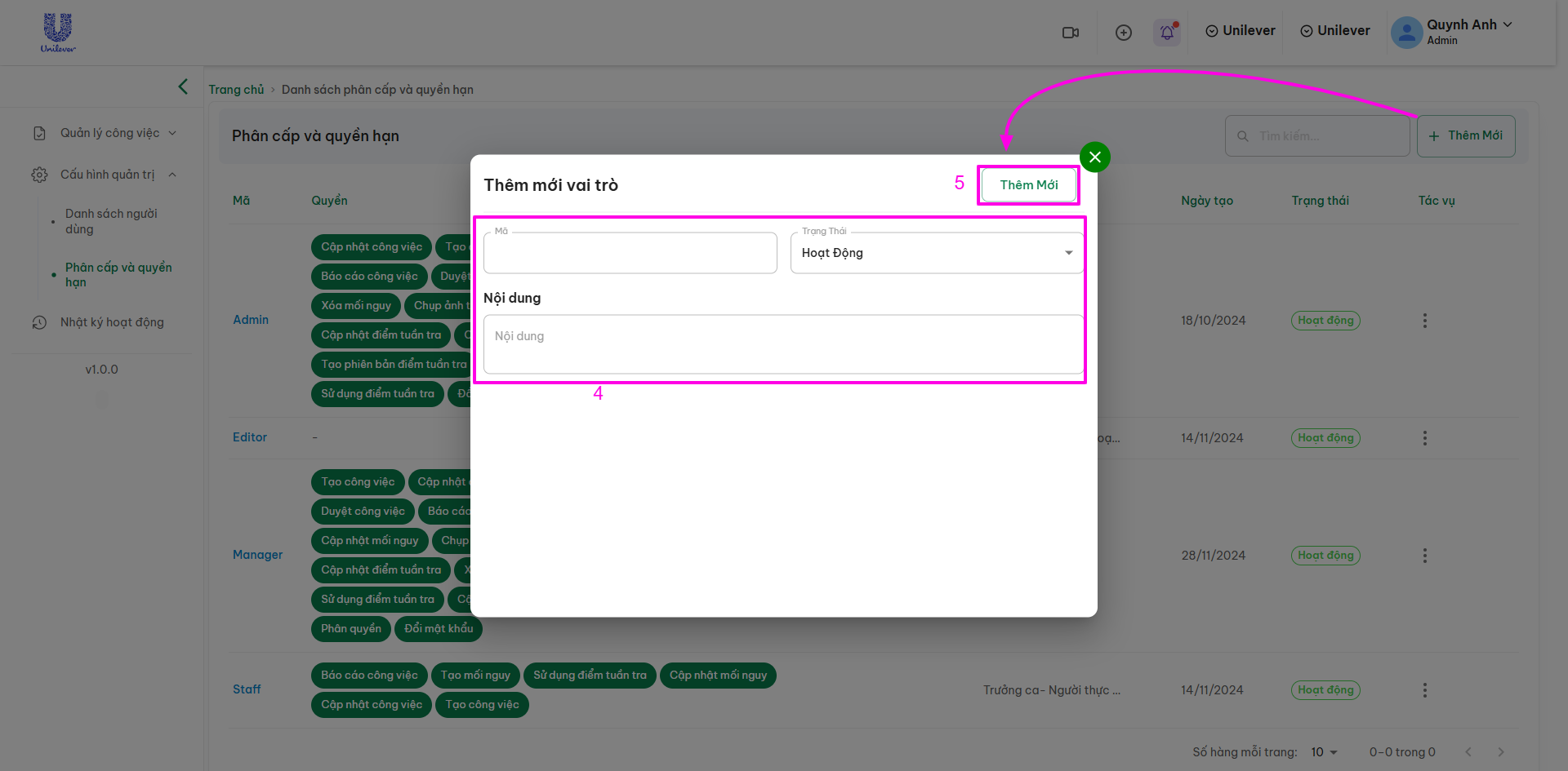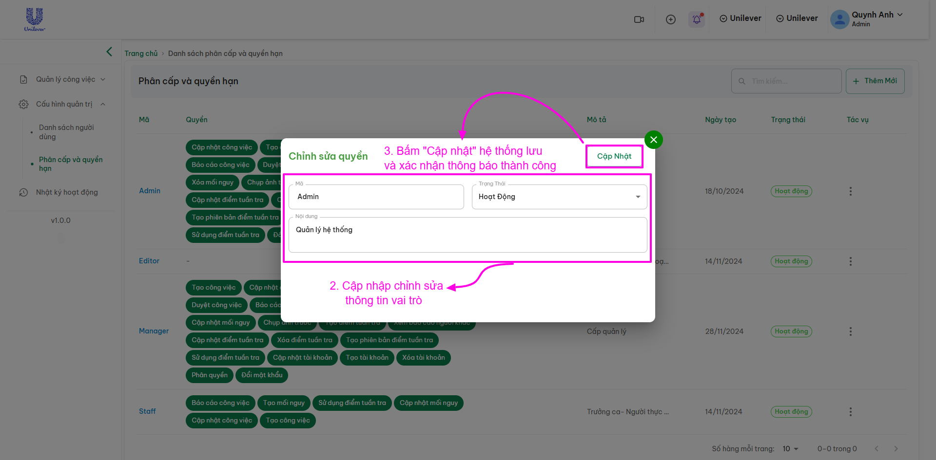 Quyền: Các quyền hạn được gán cho vai trò đó (ví dụ: Thêm, sửa, xóa, duyệt yêu cầu,...).