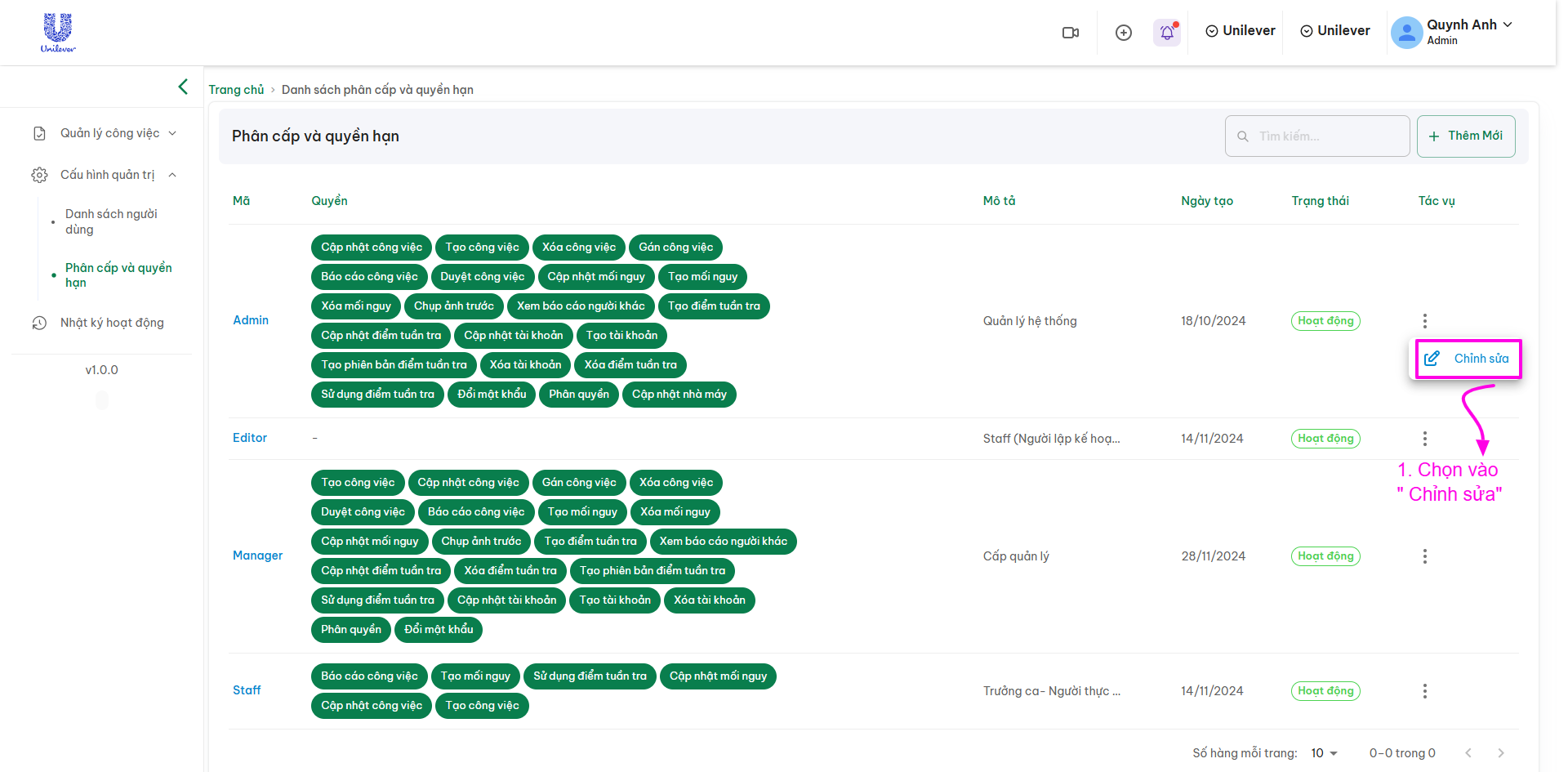 - Tác vụ: Các hành động có thể thực hiện như Chỉnh sửa cho vai trò đó.