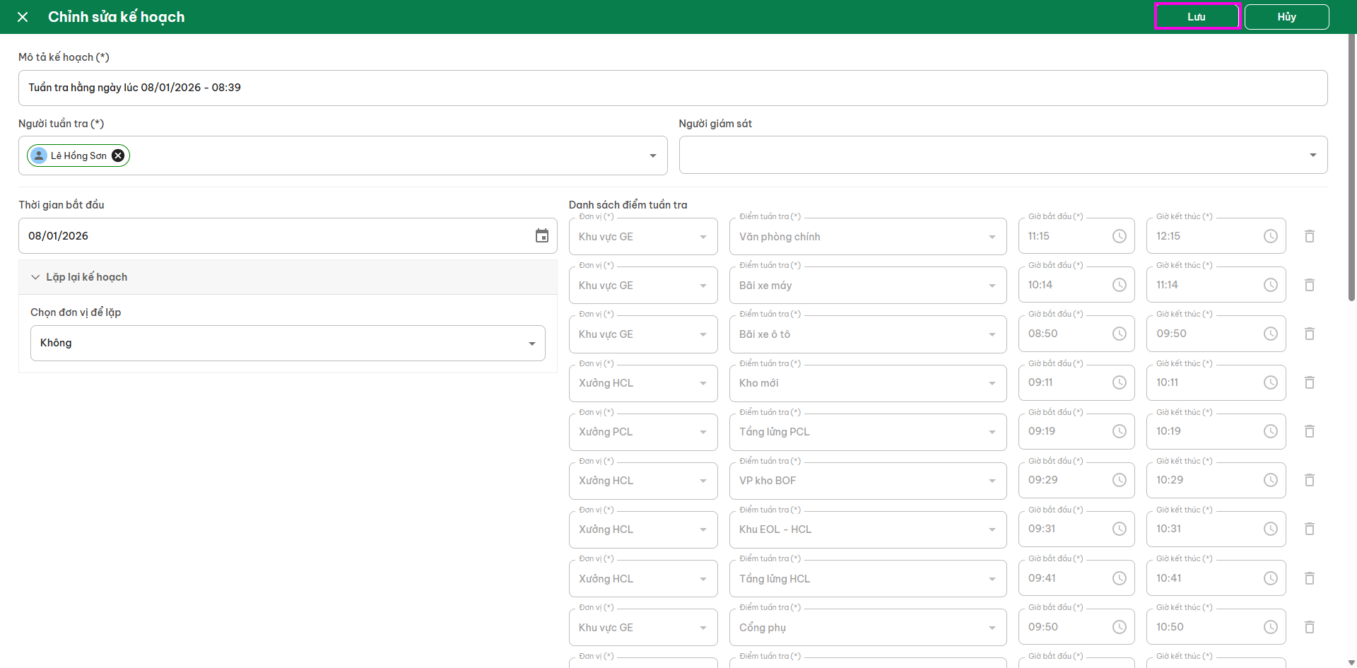+ Thời gian bắt đầu- thời gian kế thúc: thời gian bắt đầu - kết thúc của điểm tuần tra