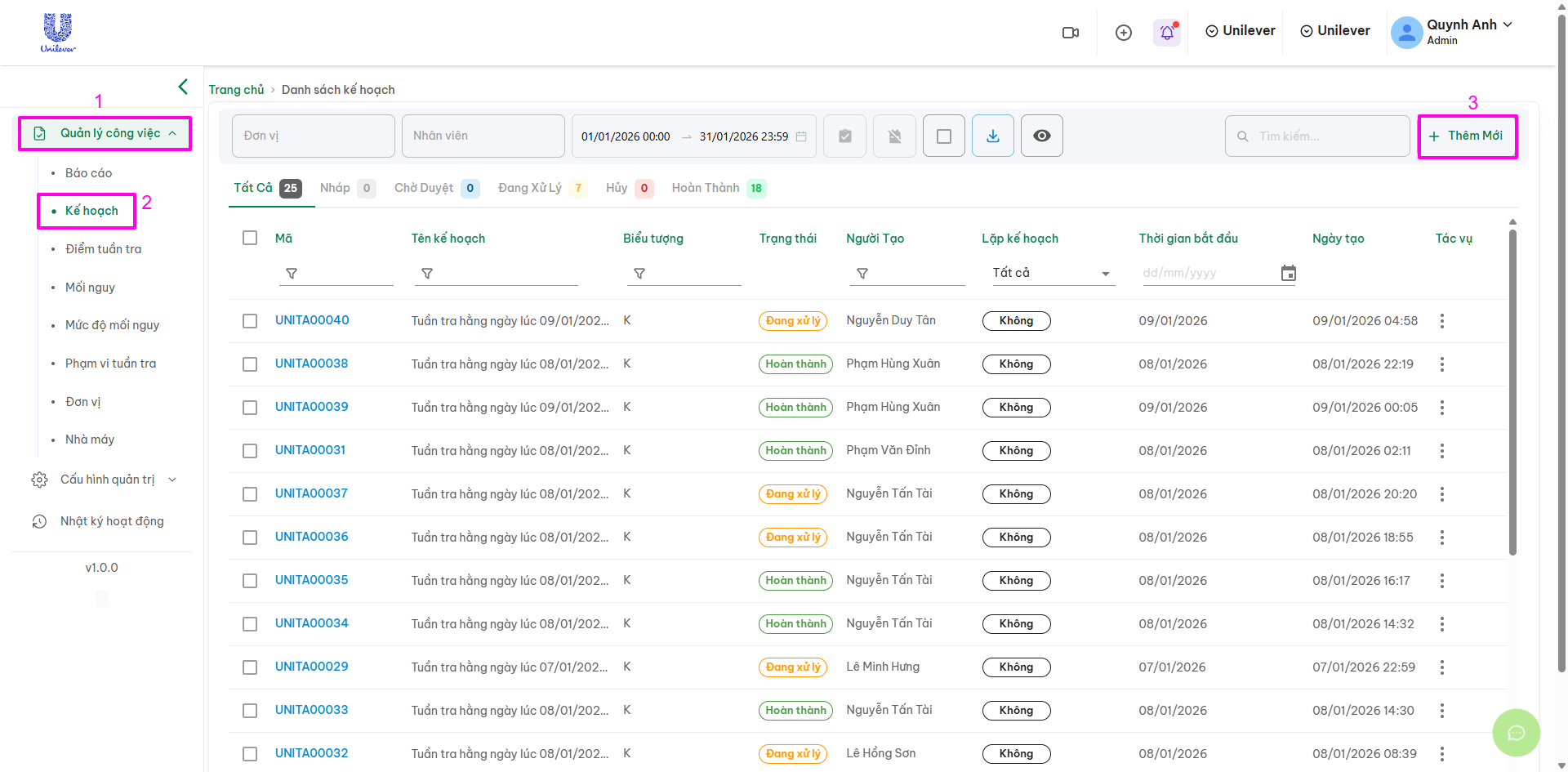Bước 1 : Quản lý công việc (1) > Kế hoạch (2) >Chọn "Thêm mới" (3)
