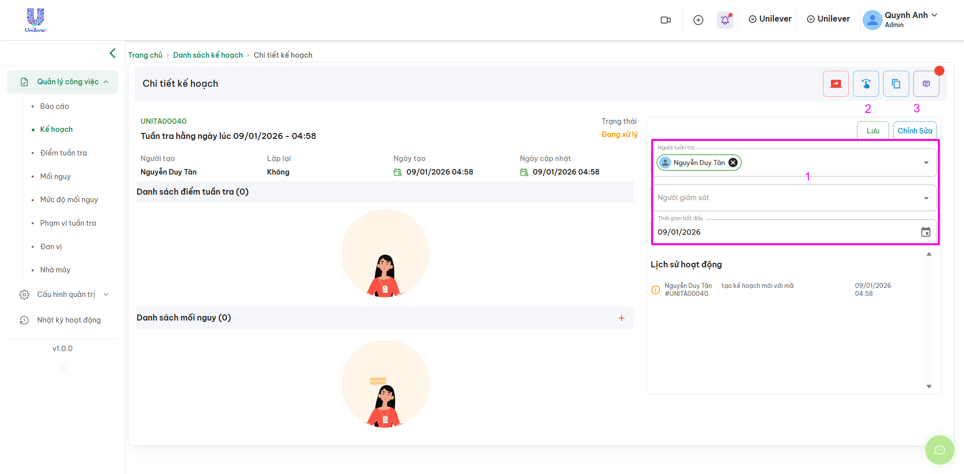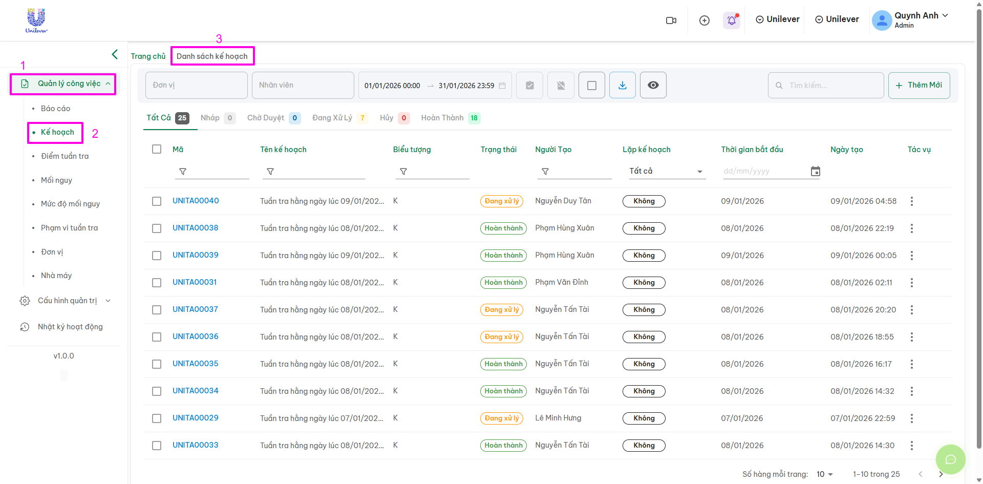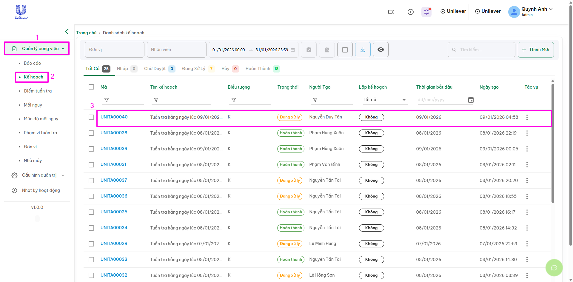 Bước 1 : Quản lý công việc(1) > Kế hoạch(2) > Chọn 1 kế hoạch (3)